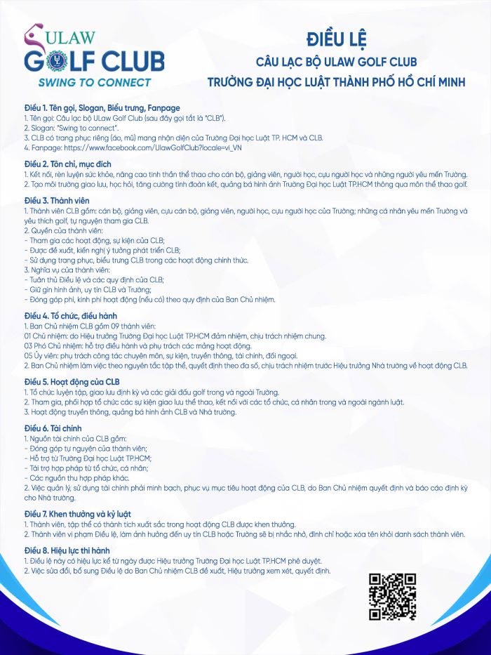 Chia sẻ tại buổi ra mắt Ulaw Golf Club, TS. Lê Trường Sơn – Hiệu trưởng gửi gắm kỳ vọng rằng CLB Golf Trường Đại học Luật TP. HCM sẽ trở thành một môi trường sinh hoạt thể thao lành mạnh để các cán bộ, giảng viên, cựu cán bộ, cựu giảng viên, người học, cựu người học của Trường và những cá nhân yêu mến Trường và yêu thích golf có thể cùng nhau chia sẻ đam mê, rèn luyện kỹ năng, qua đó góp phần nâng cao đời sống tinh thần, tăng cường gắn kết và mở ra cơ hội giao lưu, hợp tác với nhiều đối tác và doanh nghiệp.