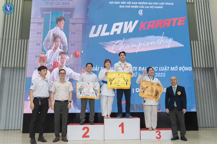 Theo thứ tự từ trái qua phải: Đồng chí Trịnh Hoàng Hiệp - Chủ tịch Hội Sinh viên Trường Đại học Luật TP.HCM; TS. Võ Trung Tín - Trưởng Bộ môn Luật Đất đai - Môi trường, Khoa Thương mại, Trường Đại học Luật TP.HCM; Đại diện Đoàn vận động viên CLB Karate Hưng Nhượng; Đại diện đoàn vận động viên Đoàn Đại học Luật TP.HCM, Đại diện Đoàn vận động viên Kazoku; Ông Lê Cảnh Thắng - Trọng tài quốc gia, Tổng trọng tài của giải đấu.