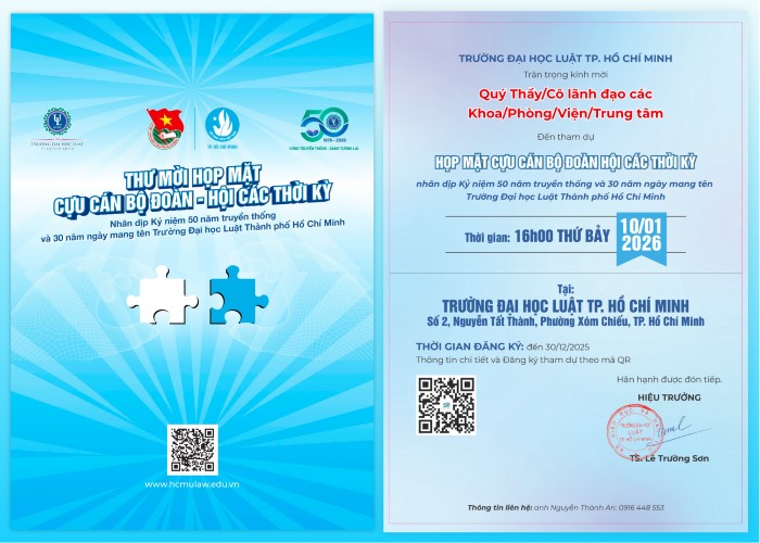Thực hiện Kế hoạch số 1725/KH – ĐHL ngày 02/12/2025 về việc tổ chức Chương trình Họp mặt cựu cán bộ Đoàn – Hội các thời kỳ nhân dịp Kỷ niệm 50 năm ngày truyền thống và 30 năm ngày mang tên Trường Đại học Luật TP. Hồ Chí Minh. Ban Tổ chức chương trình trân trọng kính mời Quý Thầy/cô đến tham dự chương trình, cụ thể như sau: