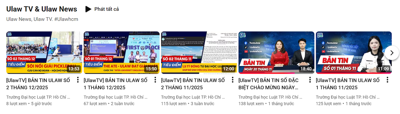 Kênh Ulaw TV ra mắt từ tháng 4/2025, hướng tới mô hình truyền thông hiện đại, chuyên nghiệp. Tính đến tháng 12/2025, kênh đã sản xuất 14 bản tin Ulaw News cùng nhiều phóng sự, tọa đàm, thu hút hàng nghìn lượt theo dõi, trở thành điểm nhấn trong công tác truyền thông của Nhà trường.