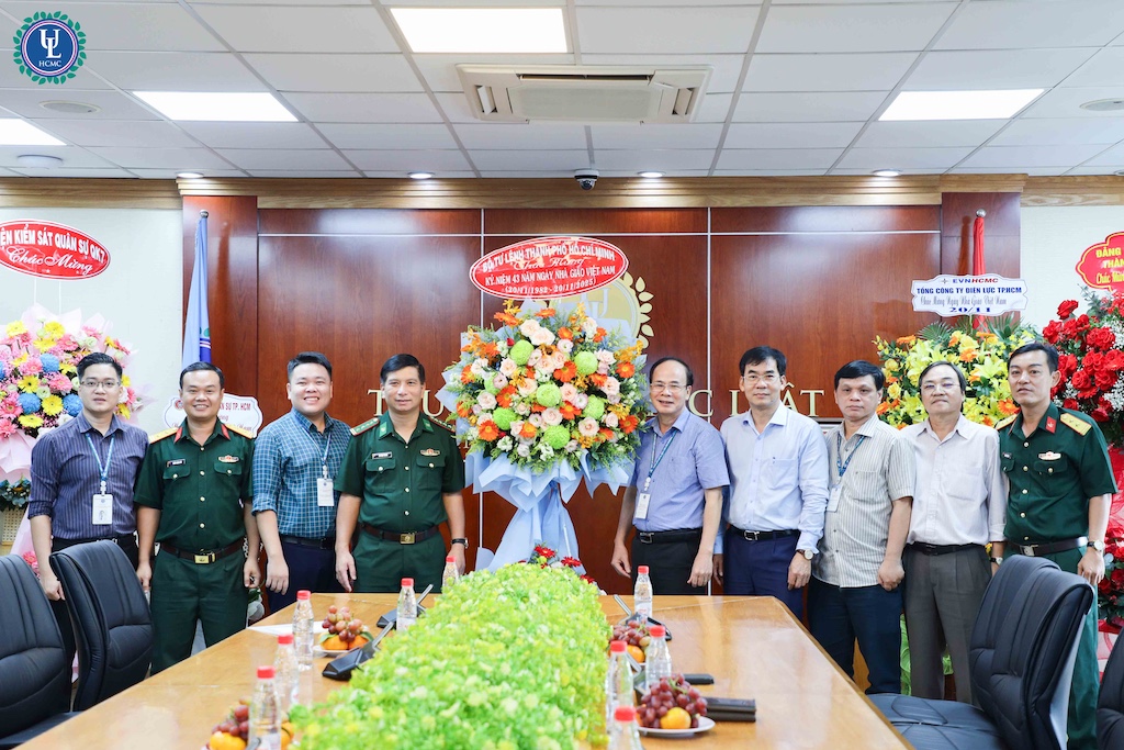 Trong cùng ngày, đoàn Bộ Tư lệnh TP.HCM do Đại tá Đỗ Vĩnh Thăng – Phó Chính ủy Bộ Tư lệnh kiêm Chính ủy Bộ đội Biên phòng TP.HCM làm trưởng đoàn đã đến thăm và gửi lời chúc mừng tập thể sư phạm Nhà trường. Đại tá Đỗ Vĩnh Thăng chúc đội ngũ giảng viên luôn mạnh khỏe, hoàn thành xuất sắc nhiệm vụ đào tạo nguồn nhân lực chất lượng cao cho Thành phố và cả nước. Bộ Tư lệnh TP.HCM cũng trao lẵng hoa thay lời tri ân đến Nhà trường. PGS.TS. Vũ Văn Nhiêm trân trọng cảm ơn tình cảm của đơn vị, đồng thời chia sẻ mong muốn hai bên tiếp tục duy trì mối quan hệ gắn kết, cùng phối hợp trong các hoạt động học thuật, bồi dưỡng, trao đổi chuyên môn và chương trình vì cộng đồng trong thời gian tới.