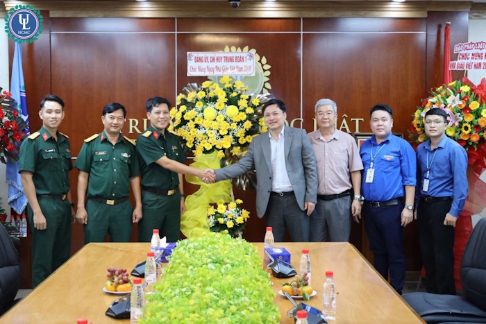 Trường cũng đón tiếp đoàn Trung đoàn 1, Sư đoàn 9, Bộ Tư lệnh TP.HCM do Trung tá, Thạc sĩ Đặng Hồng Thái - Phó Chính ủy Trung đoàn làm trưởng đoàn cùng Trung tá Đặng Ngọc Phúc - Phó Chủ nhiệm Chính trị, Bí thư Đoàn cơ sở Trung đoàn và Đại úy Phạm Minh Trí - Trợ lý Công tác Quần chúng, Phó Bí thư Đoàn cơ sở Trung đoàn đến thăm và chúc mừng nhân dịp 20/11. Thay mặt cán bộ, chiến sĩ đơn vị, Trung tá Đặng Hồng Thái gửi lẵng hoa tươi thắm cùng lời chúc sức khỏe, hạnh phúc và thành công đến Ban Giám hiệu, quý thầy cô và sinh viên Trường Đại học Luật TP.HCM. PGS.TS. Trần Việt Dũng – Phó Hiệu trưởng Nhà trường trân trọng cảm ơn sự quan tâm của Trung đoàn 1 và bày tỏ mong muốn hai bên tiếp tục tăng cường gắn kết, tạo điều kiện để sinh viên ULAW có cơ hội giao lưu, học tập tại đơn vị. Đồng thời, Nhà trường gửi lời chúc sức khỏe đến cán bộ, chiến sĩ Trung đoàn trong thực hiện nhiệm vụ bảo vệ Tổ quốc và giữ gìn môi trường ổn định cho sự phát triển của xã hội.