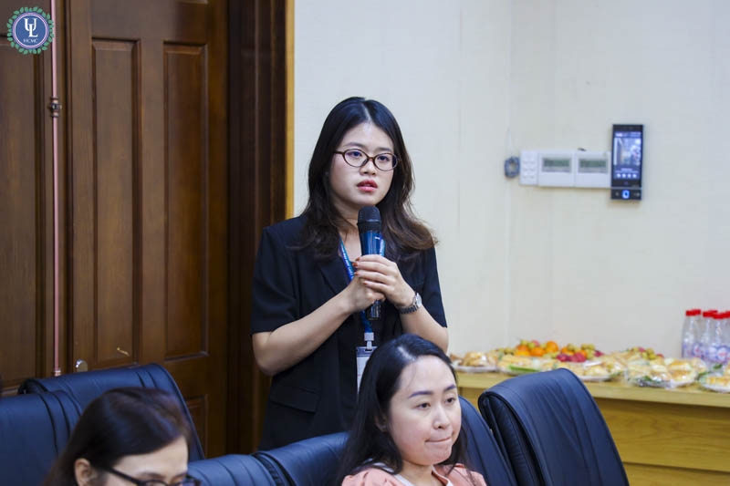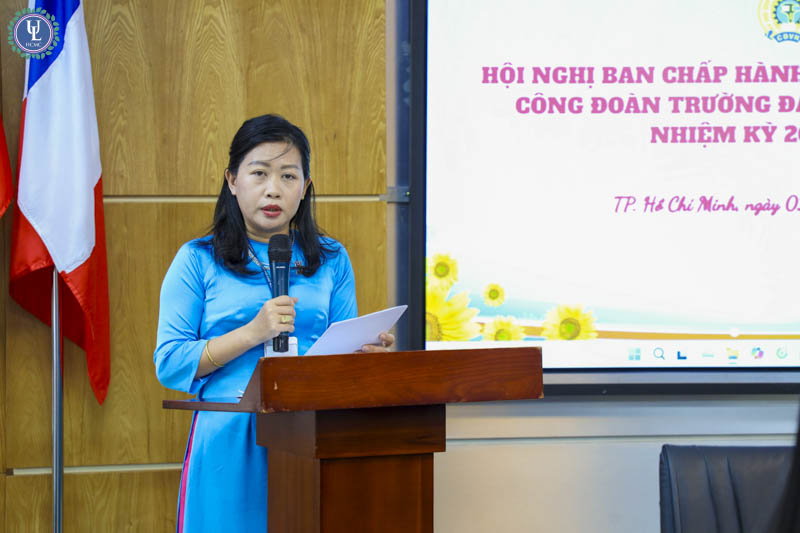 Hội nghị tiếp tục với báo cáo kiểm điểm hoạt động của Ban Chấp hành Công đoàn giai đoạn 2023–2025 do ThS. Đỗ Thị Lệ Hằng - Phó Chủ tịch Công đoàn Trường - trình bày. Theo báo cáo, hoạt động công đoàn trong thời gian qua nhận được sự quan tâm, chỉ đạo từ cấp trên và sự hỗ trợ của Ban Giám hiệu Nhà trường; đồng thời chú trọng chăm lo đời sống vật chất, tinh thần của đoàn viên, giám sát chính sách, tư vấn pháp luật. Từng ủy viên Ban Chấp hành thực hiện nghiêm túc nguyên tắc tập trung dân chủ, giữ vững đoàn kết, phối hợp hiệu quả với nhiệm vụ chuyên môn và phát huy thế mạnh của một cơ sở đào tạo trọng điểm về pháp luật.