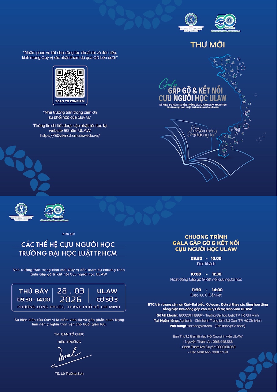 Trong không khí hân hoan chào mừng cột mốc 50 năm truyền thống vẻ vang, Trường Đại học Luật TP. HCM trân trọng kính mời Quý Anh/Chị Cựu người học cùng trở về mái trường xưa, ôn lại kỷ niệm và thắt chặt tình thân trong chương trình Gala đặc biệt này.