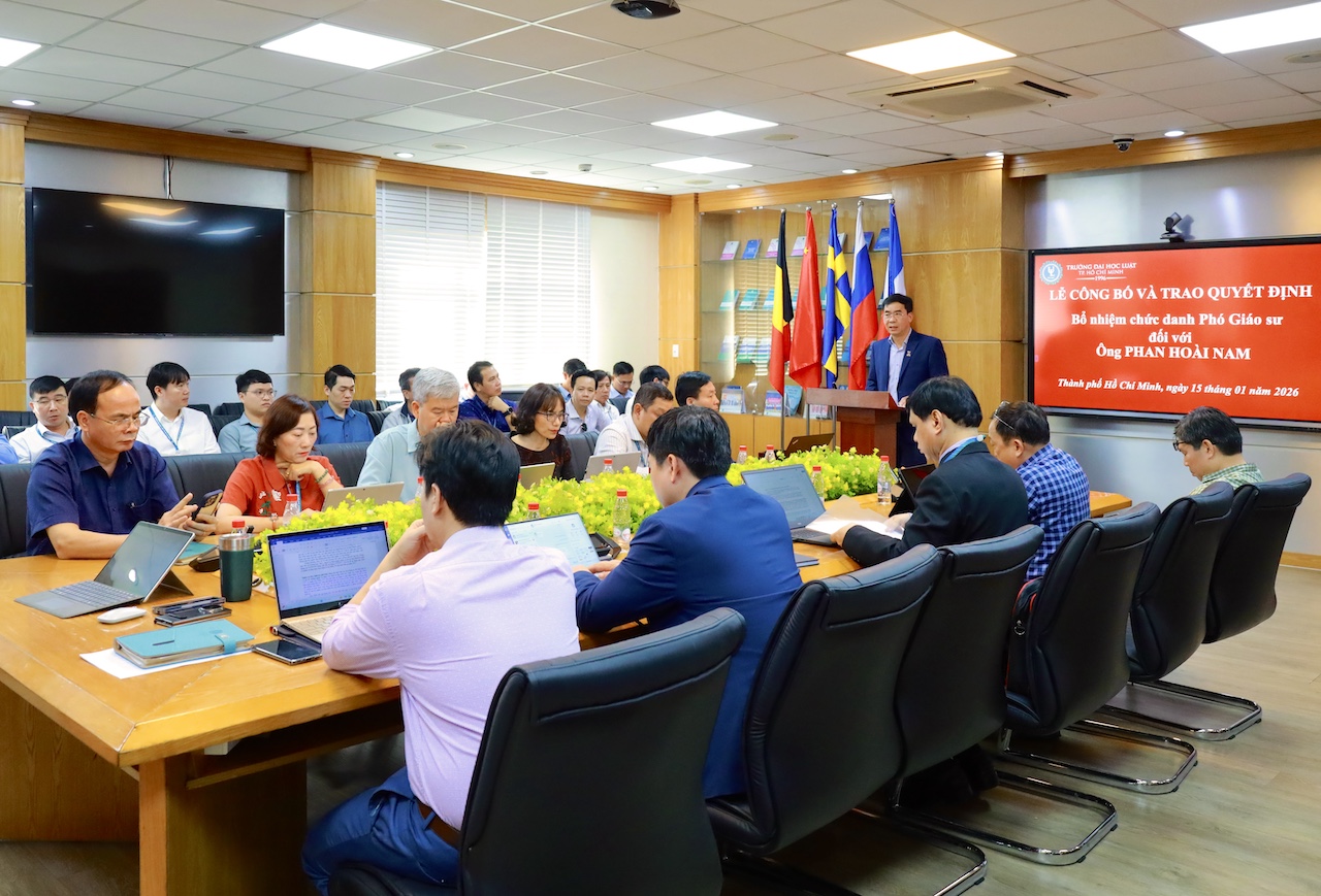 Sáng ngày 15/1/2026, Trường Đại học Luật TP.HCM tổ chức Hội nghị giao ban tháng 1/2026, đồng thời công bố và trao quyết định bổ nhiệm chức danh Phó giáo sư cho TS. Phan Hoài Nam – Phó Trưởng khoa Luật Quốc tế.