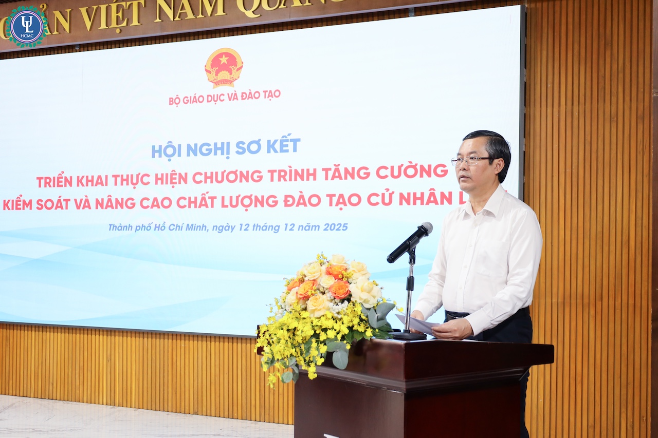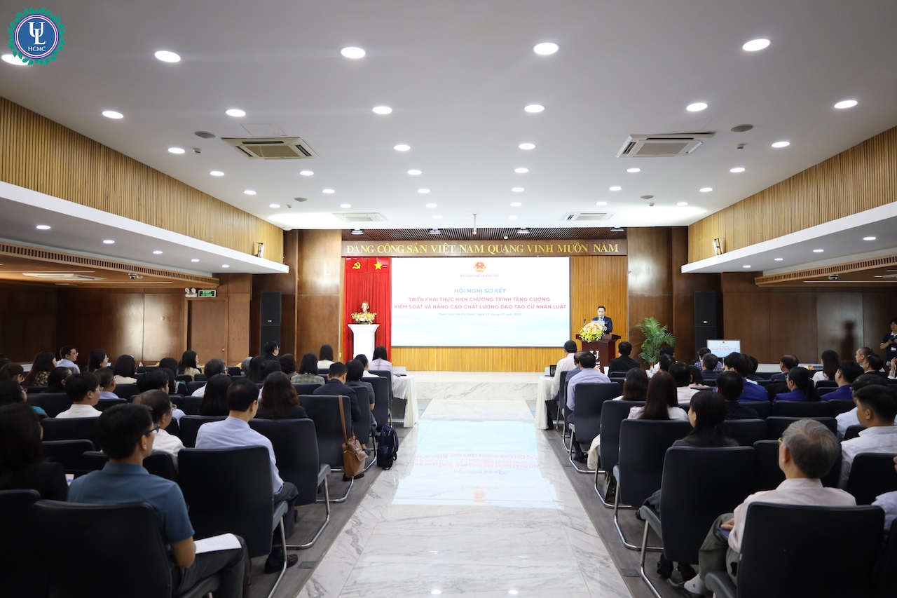 Sáng ngày 12/12/2026, Trường Đại học Luật TP.HCM đã đăng cai địa điểm để Bộ Giáo dục và Đào tạo tổ chức Hội nghị sơ kết triển khai thực hiện Chương trình “Tăng cường kiểm soát và nâng cao chất lượng đào tạo cử nhân Luật”, hội nghị diễn ra tại Hội trường A.1002, cơ sở Nguyễn Tất Thành.