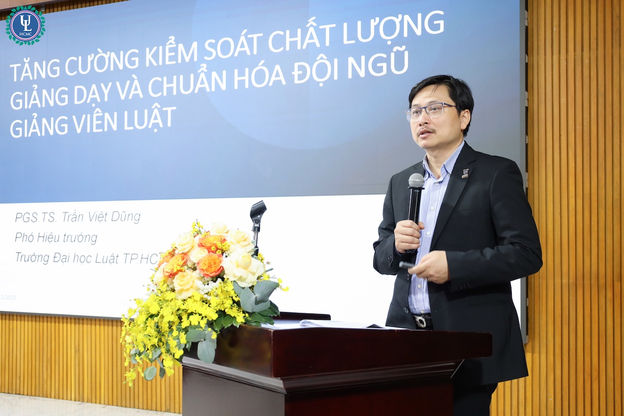 Trong tham luận “Tăng cường kiểm soát chất lượng giảng dạy và chuẩn hóa đội ngũ giảng viên Luật”, PGS.TS. Trần Việt Dũng – Phó Hiệu trưởng Trường Đại học Luật TP.HCM đã trình bày chiến lược phát triển đội ngũ giảng viên của Nhà trường, trong đó tập trung đẩy mạnh đào tạo tiến sĩ trong và ngoài nước. Giai đoạn 2020–2025, Nhà trường có 6 nghiên cứu sinh đã và đang theo học tiến sĩ tại Thụy Sĩ, Hungary, Pháp, Phần Lan và Cộng hòa Séc; 19 nghiên cứu sinh đang học tiến sĩ trong nước. Đồng thời, Trường tích cực đàm phán, xây dựng các chương trình hợp tác đồng hướng dẫn nghiên cứu sinh với các đối tác tại Anh, Estonia, Hungary và New Zealand.