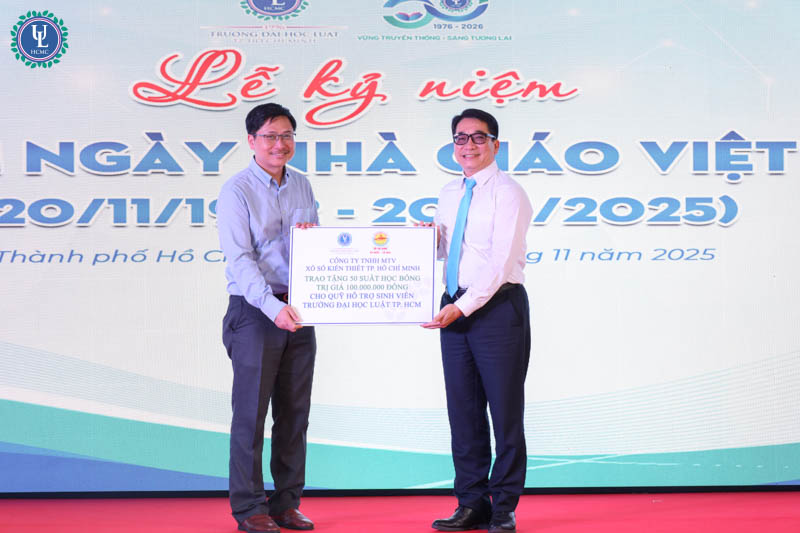 Đại diện Công ty TNHH MTV Xổ Số Kiến Thiết TP. HCM trao tặng 50 suất học bổng dành cho sinh viên Trường Đại học Luật TP. HCM