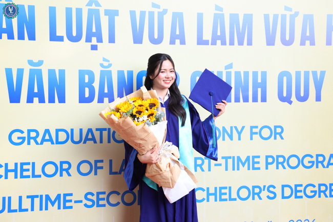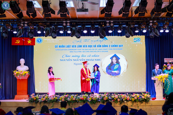 Đại diện toàn thế các tân cử nhân, sinh viên Nguyễn Hữu Khoa - Lớp trưởng lớp 14B Văn bằng 2 Chính quy, một trong hai sinh viên tốt nghiệp loại Xuất Sắc đã gửi lời tri ân chân thành đến Nhà trường và các quý thầy cô giảng viên. Chia sẻ lại buổi lễ, anh Nguyễn Hữu Khoa nhấn mạnh các anh chị sinh viên dù đến với Nhà trường với những xuất phát điểm khác nhau, nhưng lại là những người cùng nhau học tập, đồng hành dưới ngôi nhà Ulaw bằng tinh thần cầu tiến và khát vọng tri thức. Theo đó, quãng thời gian học tập tại trường đã trở thành những ký ức tươi đẹp, khó quên của tuổi trẻ. Chính nhờ những trải nghiệm ấy đã góp phần tôi luyện cho các anh chị sinh viên bản lĩnh, tinh thần trách nhiệm và ý thức cống hiến, sẵn sàng lan tỏa những giá trị tốt đẹp cho xã hội, cộng đồng. Lễ tốt nghiệp không chỉ là sự ghi nhận cho những nỗ lực bền bỉ của sinh viên trong suốt hành trình học tập, mà còn là minh chứng cho niềm tin, tâm huyết và sự dẫn dắt tận tâm của thầy cô – những người đã âm thầm gieo vào lòng sinh viên tinh thần thượng tôn pháp luật và trách nhiệm của người làm luật trong tương lai.