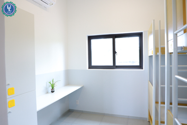 Không gian phòng ở được bố trí gọn gàng, đầy đủ giường, tủ và bàn học đáp ứng nhu cầu sinh hoạt cơ bản cho sinh viên