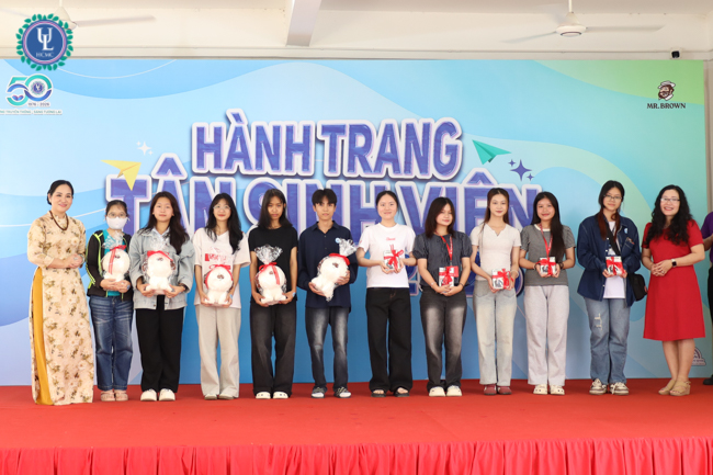 TS. Tô Nhi A - Giảng viên Khoa KHCB, Chuyên gia tâm lý cùng TS.GVC. Nguyễn Thị Ánh Hồng - Trưởng bộ môn Luật Hình sự trao tặng phần quà cho các bạn tân sinh viên may mắn