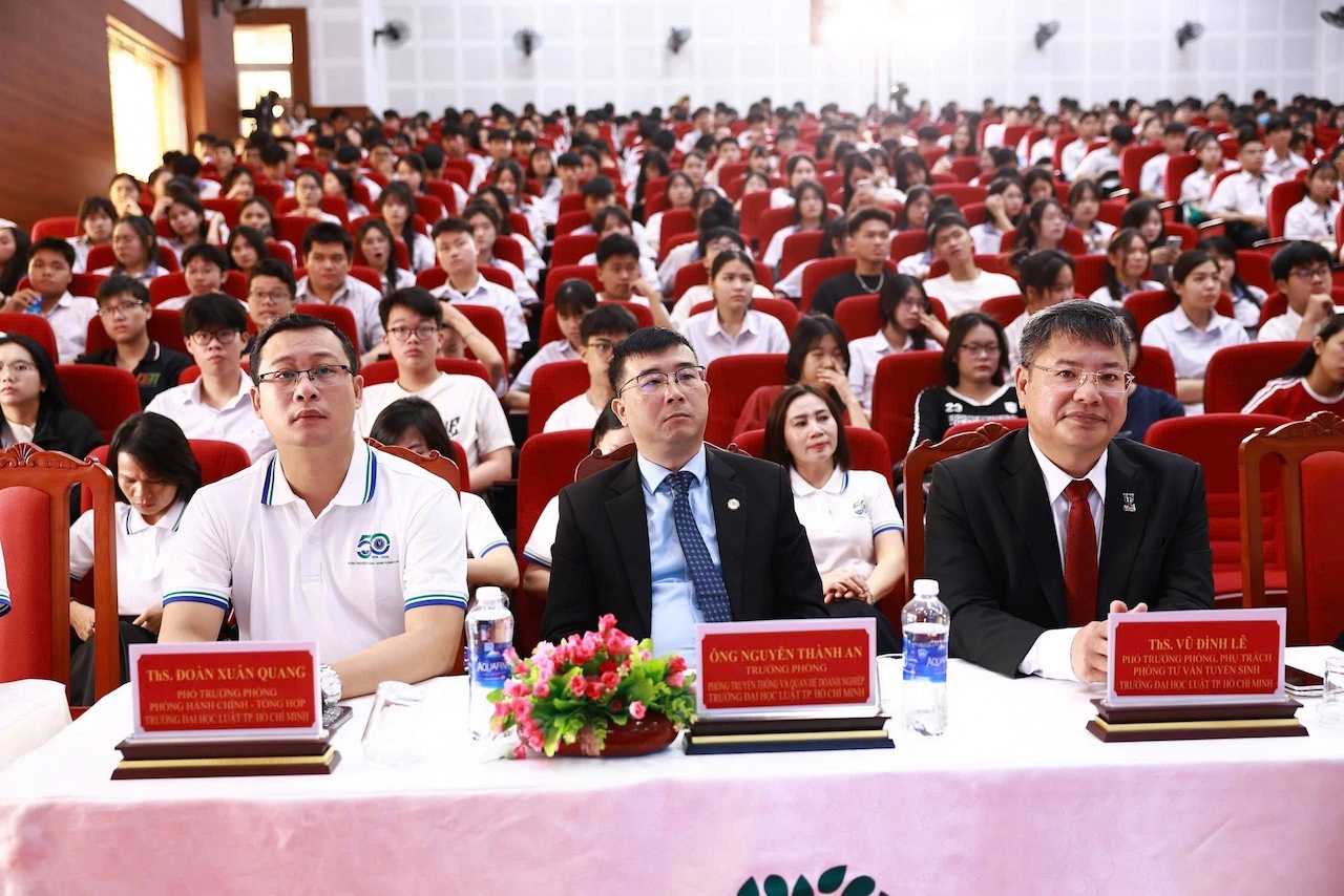 Tại hội trường, các em học sinh đã được lắng nghe những thông tin tuyển sinh quan trọng nhất cho năm 2026. ThS. Vũ Đình Lê – Phó Trưởng phòng phụ trách Phòng Tư vấn tuyển sinh đã giới thiệu chi tiết về các ngành đào tạo cốt lõi như Luật, Luật Thương mại quốc tế, Quản trị - Luật, Quản trị kinh doanh, Ngôn ngữ Anh,... cũng như các ngành dự kiến mở mới như Thương mại điện tử, Kinh tế số, Công nghệ tài chính, Ngôn ngữ Trung Quốc (chuyên ngành tiếng Trung pháp lý).
