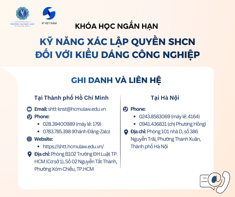 Liên hệ: 028.39400989 (máy lẻ: 179 - giờ hành chính) hoặc 0783.785.398 (Anh Khánh Đăng) hoặc Nhắn tin trực tiếp qua Fanpage Viện Sở hữu trí tuệ, Khởi nghiệp & Đổi mới sáng tạo