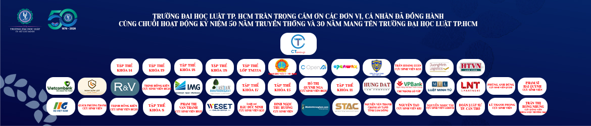 Lời cảm ơn quý nhà tài trợ, đồng hành và các tập thể, cá nhân đã đồng hành cùng chuỗi hoạt động kỷ niệm 50 năm truyền thống và 30 năm mang tên Trường Đại học Luật Thành phố Hồ Chí Minh