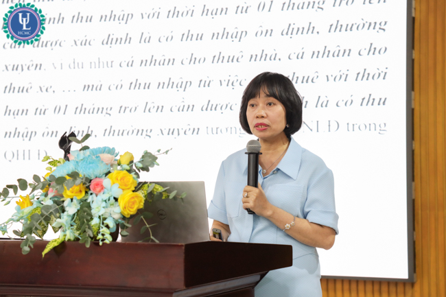 TS.GVC. Nguyễn Thị Bích - Trường Đại học Luật TP.HCM sự trình bày tham luận “Chính sách bảo hiểm xã hội hiện hành - Đảm bảo an ninh xã hội cho lao động tự do trong nền kinh tế số”