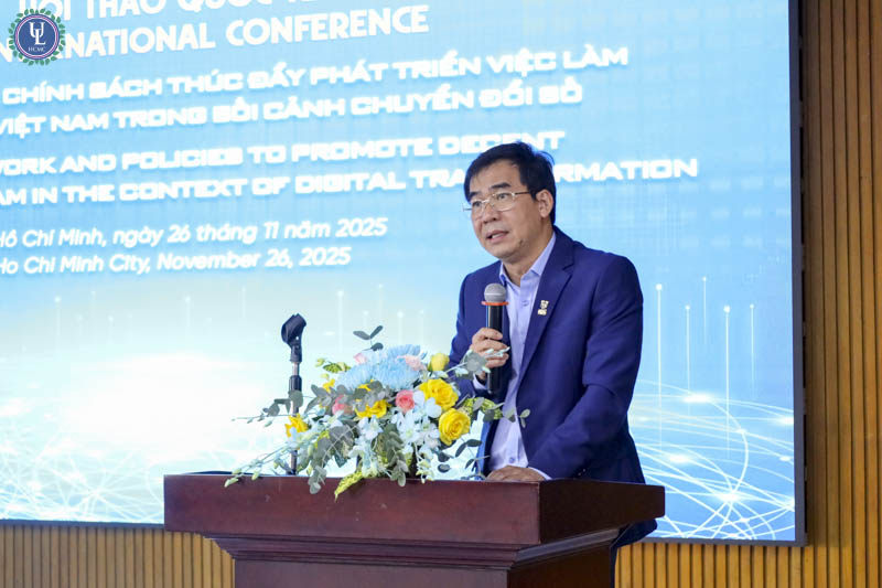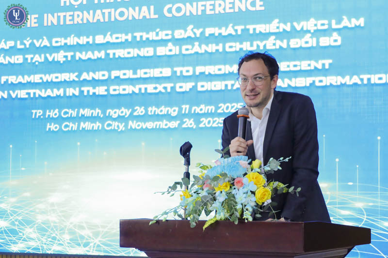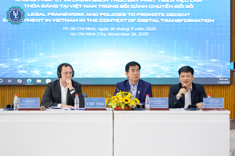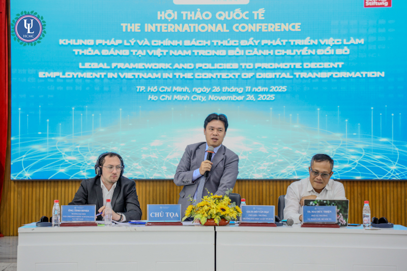 Vào ngày 26/11/2025, tại Hội trường A.1002 - cơ sở Nguyễn Tất Thành, Trường Đại học Luật TP.HCM tổ chức Hội thảo quốc tế “Khung pháp lý và chính sách thúc đẩy phát triển việc làm thỏa đáng tại Việt Nam trong bối cảnh chuyển đổi số”, dưới sự tài trợ của Viện Friedrich Ebert Stiftung (FES) CHLB Đức cùng với sự tham gia đông đảo các chuyên gia, học giả trong và ngoài nước nhằm thảo luận về cơ hội và thách thức đối với người lao động trong kỷ nguyên số. Sự kiện là một trong những hội thảo quốc tế đặc biệt hướng tới kỷ niệm 50 năm truyền thống và 30 năm mang tên Trường.