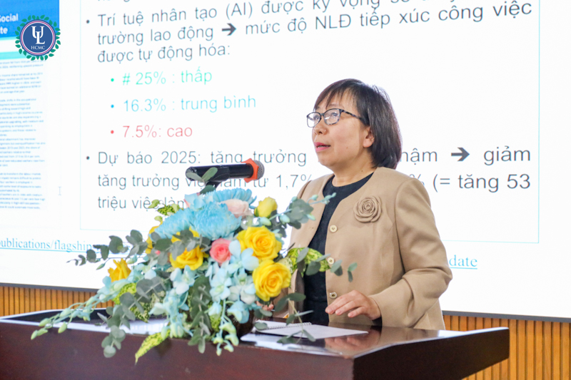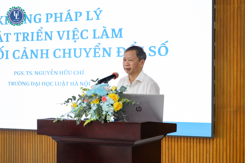 Ở bài tham luận mở đầu, PGS.TS. Nguyễn Hữu Chí - Trường Đại học Luật Hà Nội trình bày tham luận “Khung pháp lý phát triển việc làm trong bối cảnh chuyển đổi số” nhấn mạnh vấn đề phát triển việc làm trong tình hình này cần phải chú ý đến tính bền vững, không chỉ dừng ở việc tạo ra việc làm mới mà còn bao gồm duy trì việc làm chất lượng và hiệu quả phù hợp với mục tiêu phát triển kinh tế - xã hội. Điều này đòi hỏi pháp luật phải linh hoạt thích ứng, vừa thúc đẩy đổi mới sáng tạo vừa bảo vệ quyền lợi người lao động. Đồng thời cũng chỉ ra hạn chế lớn về kỹ năng số của lao động Việt Nam, đặc biệt trong khu vực phi chính thức và ở nhóm lao động nữ hoặc người lớn tuổi. Khoảng cách kỹ năng giữa các nhóm lao động và giữa doanh nghiệp lớn - nhỏ ngày càng gia tăng, trong khi đào tạo nghề vẫn thiếu nội dung kỹ năng số, thiếu linh hoạt và thiếu giảng viên có kinh nghiệm thực tiễn trong các lĩnh vực như dữ liệu, IoT hay AI.