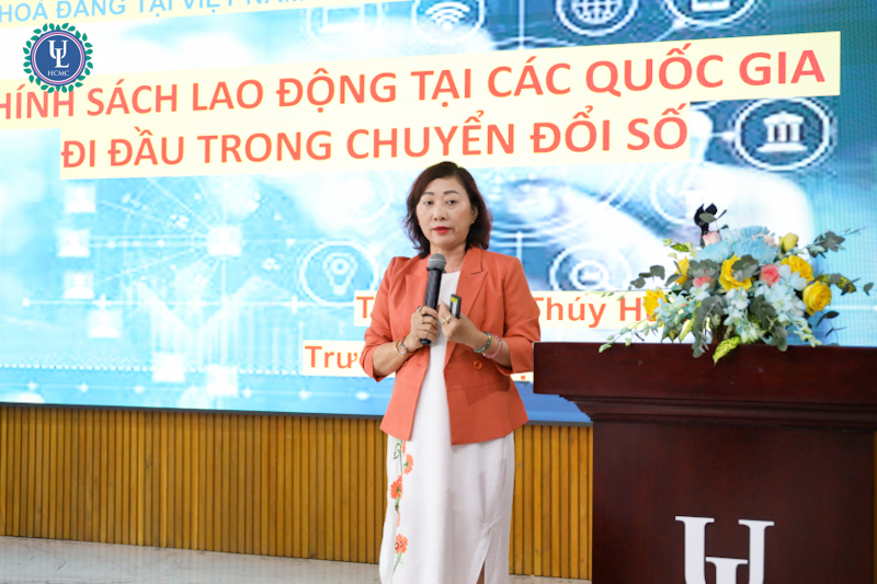 TS.GVCC. Lê Thị Thúy Hương - Trường Đại học Luật TP.HCM với bài tham luận về chủ đề “Chính sách lao động tại các quốc gia đi đầu trong chuyển đổi số”