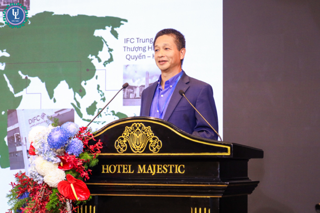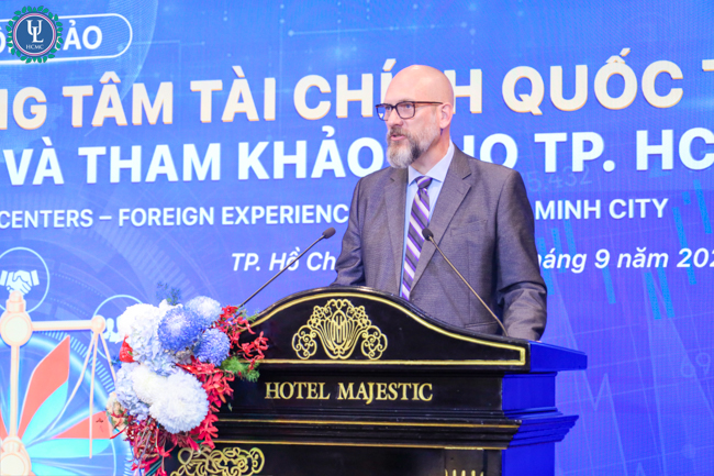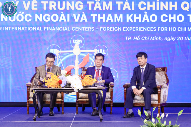 Tiếp nối chương trình, phát biểu tại hội thảo, TS. Lê Trường Sơn - Hiệu trưởng Trường Đại học Luật TP.HCM, đơn vị đồng tổ chức hội thảo khẳng định việc triển khai Nghị quyết của Chính phủ về xây dựng trung tâm tài chính quốc tế là nhiệm vụ có ý nghĩa đặc biệt quan trọng trong bối cảnh toàn cầu hiện nay. Ông nhấn mạnh trung tâm tài chính quốc tế là động lực cho đổi mới sáng tạo, quản trị rủi ro và tăng cường gắn kết toàn cầu. Để hiện thực hóa kế hoạch xây dựng trung tâm tài chính quốc tế, Việt Nam cần phải xây dựng được một khung pháp lý đúng đắn và phù hợp. Ông kỳ vọng với sự tham gia đóng góp trí tuệ của các chuyên gia, nhà khoa học và nhà quản lý trong hội thảo lần này, việc hoạch định một khung pháp lý phù hợp sẽ sớm được hình thành, góp phần đưa TP.HCM trở thành trung tâm tài chính quốc tế phát triển bền vững.