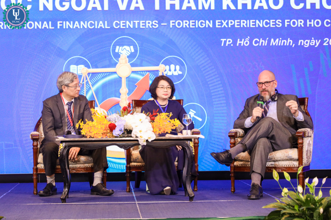 Trong phần tiếp theo, GS.TS. Lê Hồng Hạnh - Chủ tịch Trung tâm trọng tài quốc tế Việt Nam đã trình bày tham luận “Khung pháp luật về trung tâm tài chính quốc tế kinh nghiệm nước ngoài và một số hàm ý cho trung tâm tài chính quốc tế Thành phố Hồ Chí Minh”. Khung pháp luật là một vấn đề cốt lõi nhất để trung tâm tài chính quốc tế có thể tồn tại và phát triển. Khung pháp lý cần bao gồm bốn yếu tố: mô hình quản trị phù hợp, luật áp dụng rõ ràng, mức độ gắn kết với tài chính quốc tế và cơ chế giải quyết tranh chấp minh bạch, kịp thời. Hiện nay, nhiều yếu tố pháp lý còn chưa rõ ràng, thiếu mô hình quản lý phù hợp, vì vậy, cần phải xây dựng mô hình quản lý chuẩn quốc tế, phù hợp với đơn vị tài chính cũng như xây dựng một khung pháp lý hoàn chỉnh.