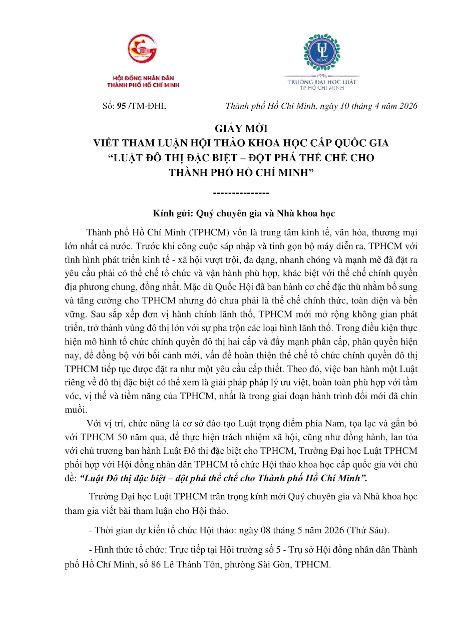 Trường Đại học Luật TPHCM trân trọng kính mời Quý chuyên gia và Nhà khoa học tham gia viết bài tham luận cho Hội thảo.