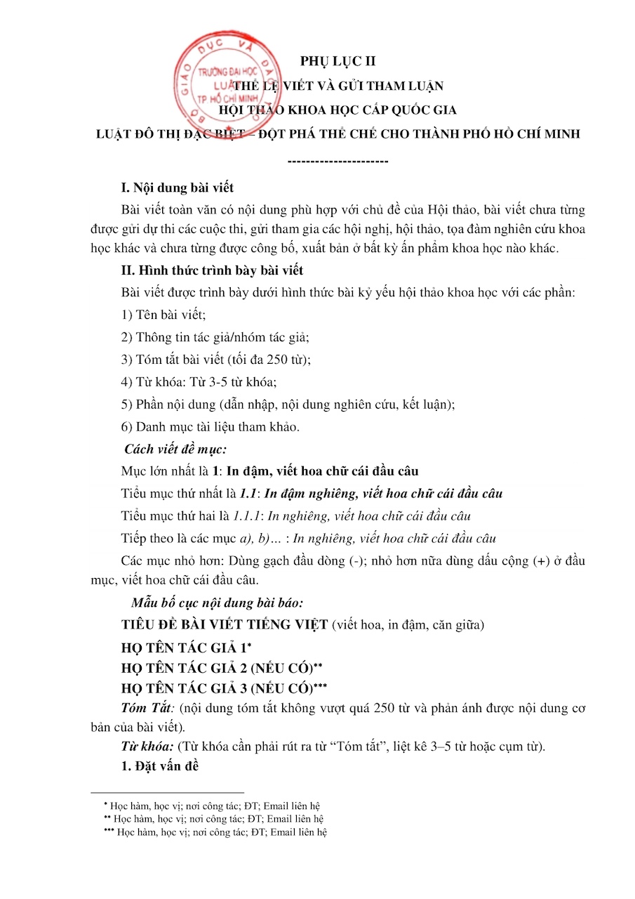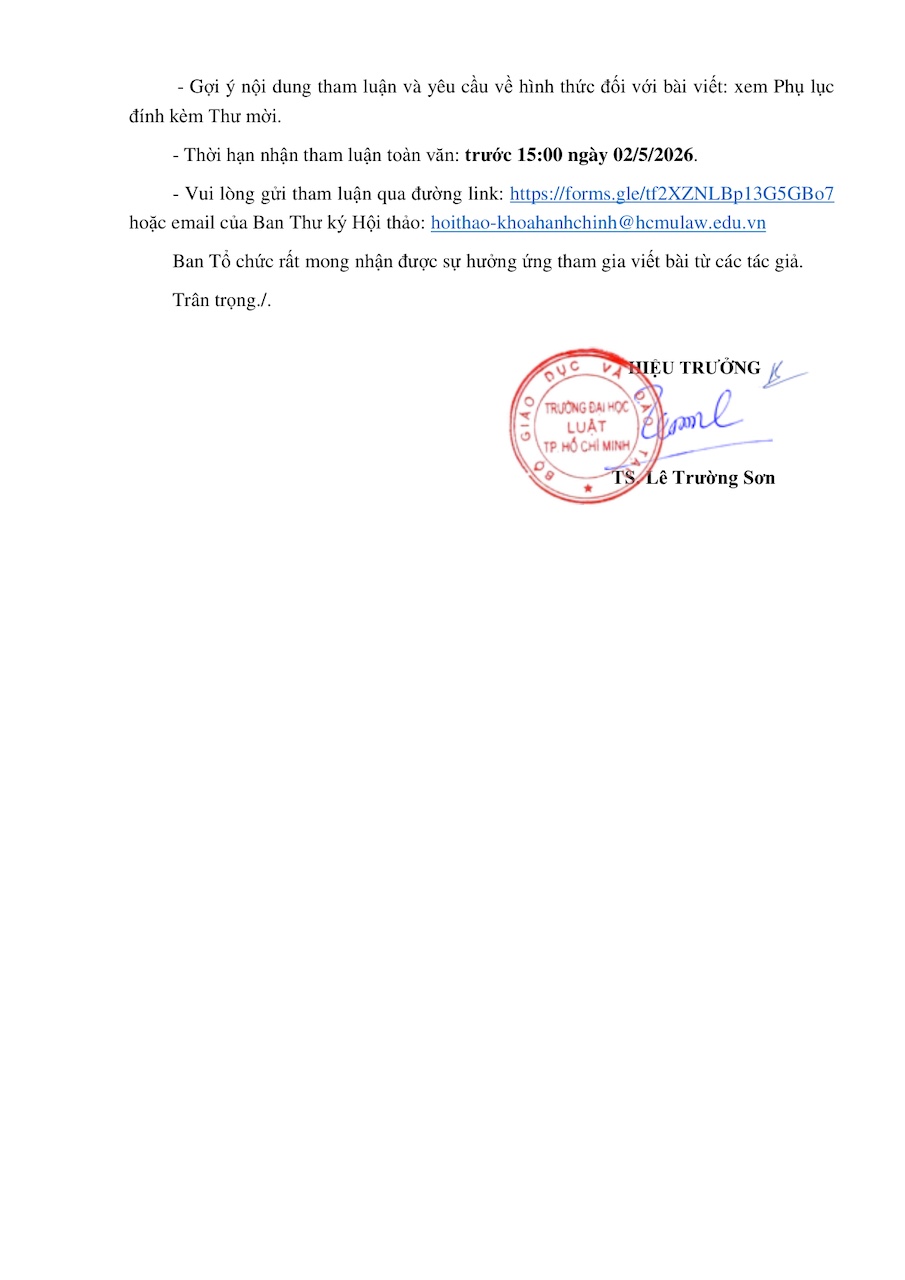 - Vui lòng gửi tham luận qua đường link: https://forms.gle/tf2XZNLBp13G5GBo7 hoặc email của Ban Thư ký Hội thảo: hoithao-khoahanhchinh@hcmulaw.edu.vn