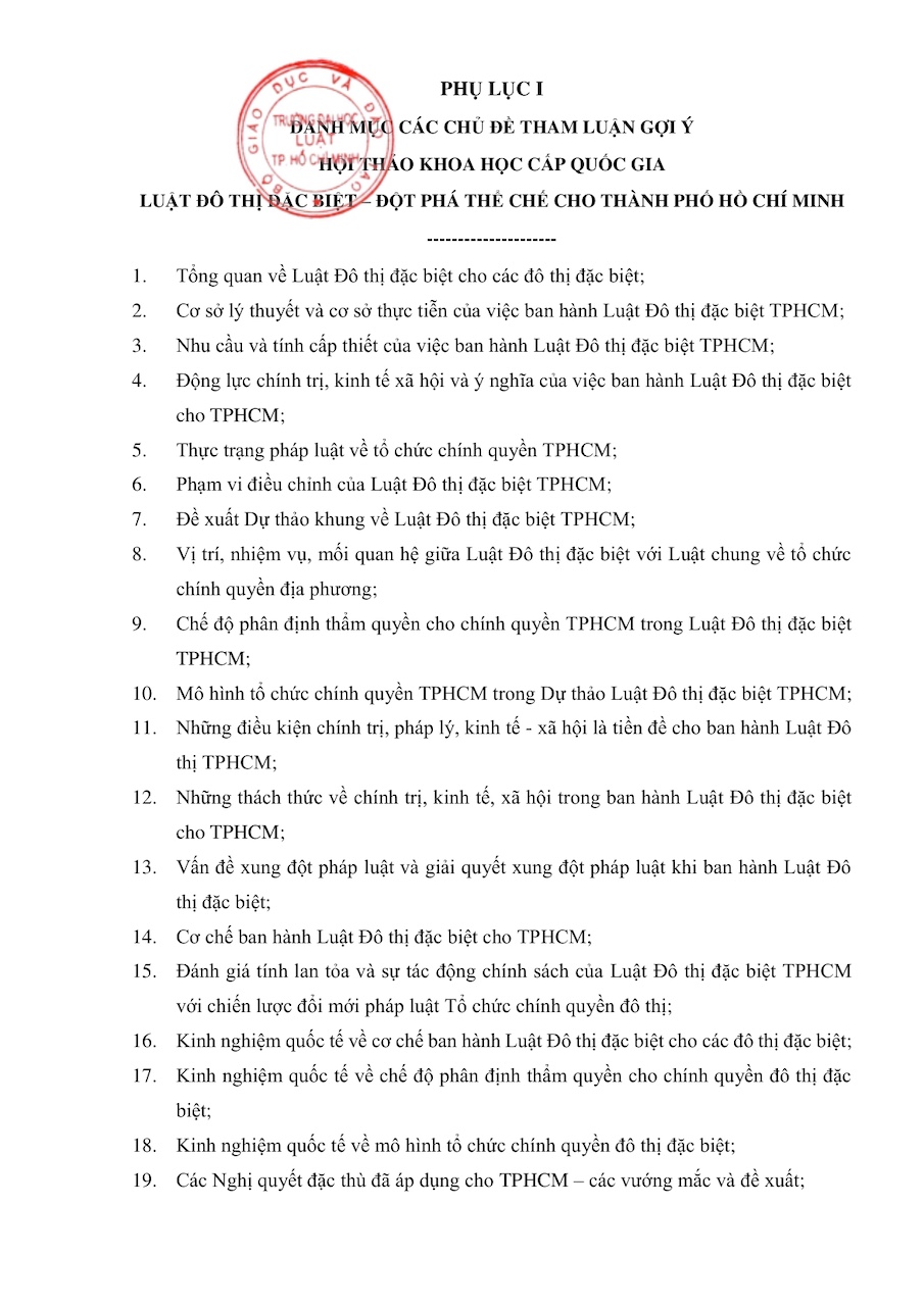 Với vị trí, chức năng là cơ sở đào tạo Luật trọng điểm phía Nam, tọa lạc và gắn bó với TPHCM 50 năm qua, để thực hiện trách nhiệm xã hội, cũng như đồng hành, lan tỏa với chủ trương ban hành Luật Đô thị đặc biệt cho TPHCM, Trường Đại học Luật TPHCM phối hợp với Hội đồng nhân dân TPHCM tổ chức Hội thảo khoa học cấp quốc gia với chủ đề: “Luật Đô thị đặc biệt – đột phá thể chế cho Thành phố Hồ Chí Minh”.