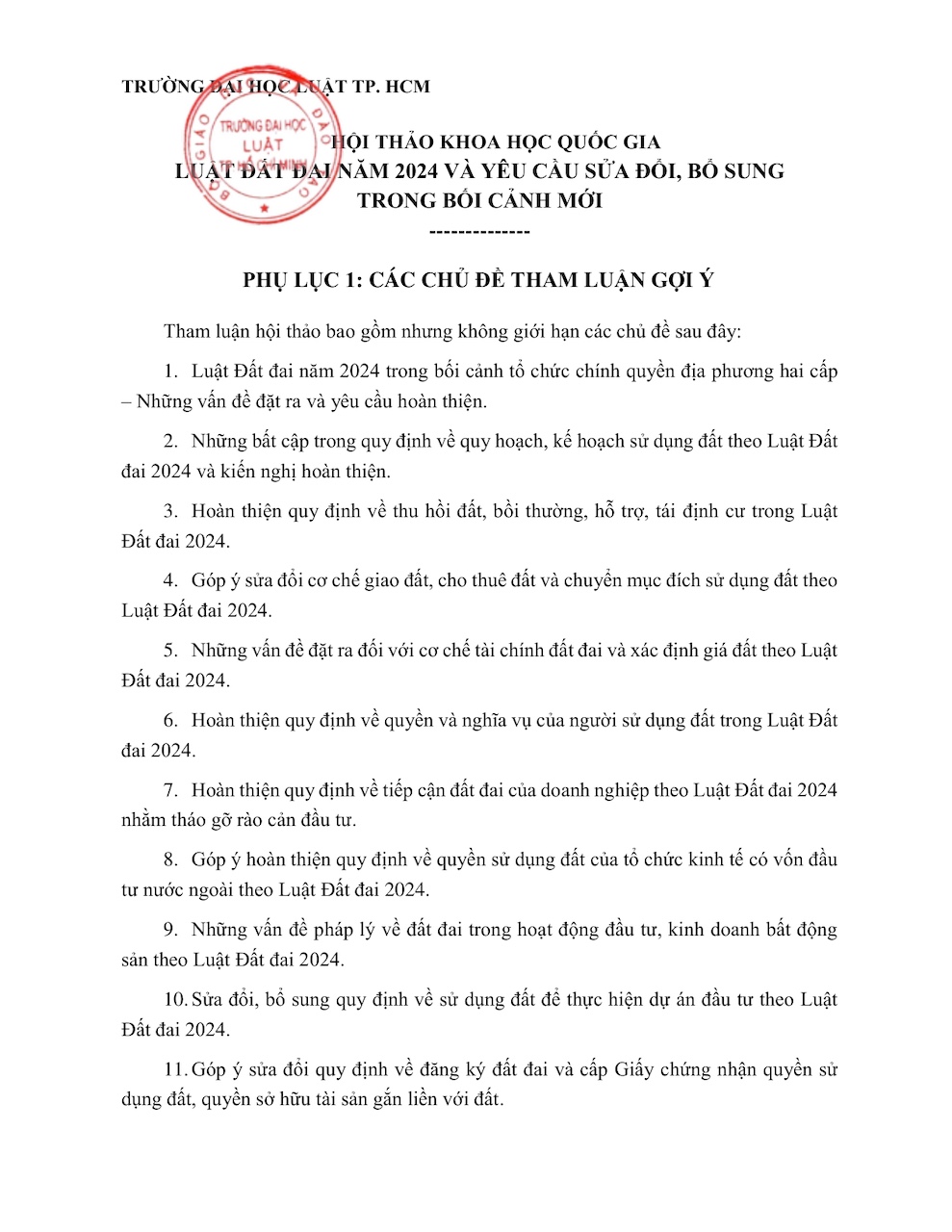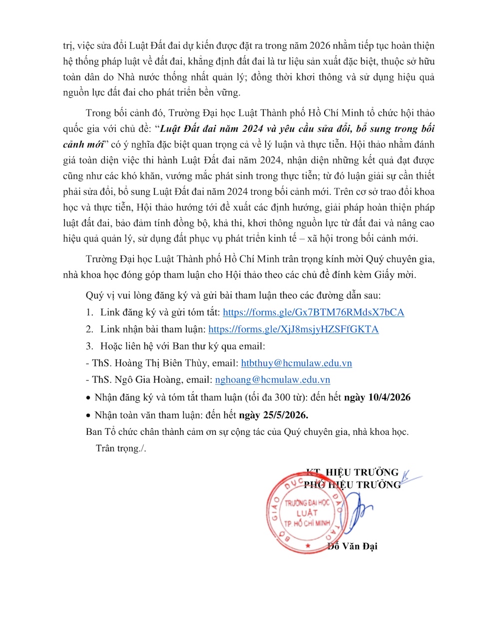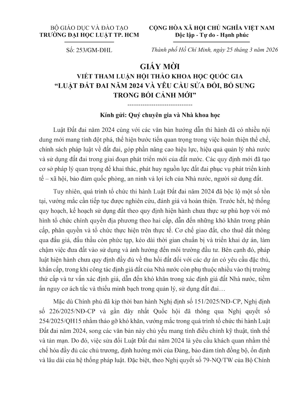 Trường Đại học Luật Thành phố Hồ Chí Minh trân trọng kính mời Quý chuyên gia, nhà khoa học đóng góp tham luận cho Hội thảo theo các chủ đề đính kèm Giấy mời.
