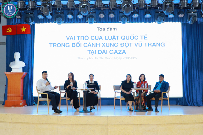 Nhằm đáp ứng nhu cầu nghiên cứu và trao đổi học thuật về luật pháp quốc tế trong bối cảnh xung đột vũ trang tại Dải Gaza, tối ngày 2/10, Khoa Luật Quốc tế, Trường Đại học Luật TP. HCM đã tổ chức buổi Tọa đàm “Vai trò của Luật quốc tế trong bối cảnh xung đột vũ trang tại Dải Gaza”, thu hút đông đảo các chuyên gia, giảng viên và sinh viên đến tham dự tại Hội trường C.302, cơ sở Nguyễn Tất Thành.