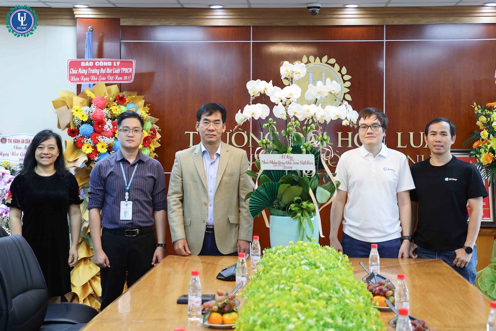 Ngoài ra, ông Trần Quang Đức – CEO AI Hay cùng Ban Điều hành cũng đến thăm và gửi lẵng hoa chúc mừng Trường nhân dịp 20/11. TS. Lê Trường Sơn cảm ơn sự đồng hành của AI Hay trong các hoạt động chuyển đổi số của Nhà trường, đặc biệt là cuộc thi ứng dụng AI vừa qua nhằm lan tỏa tinh thần đổi mới trong đội ngũ viên chức. Hiệu trưởng cho biết ULAW đang xây dựng Đề án chuyển đổi số giai đoạn 2026–2030, tầm nhìn đến 2045 và mong muốn tiếp tục nhận được sự hợp tác, hỗ trợ về chuyên môn từ AI Hay để triển khai hiệu quả các mục tiêu trong thời gian tới.