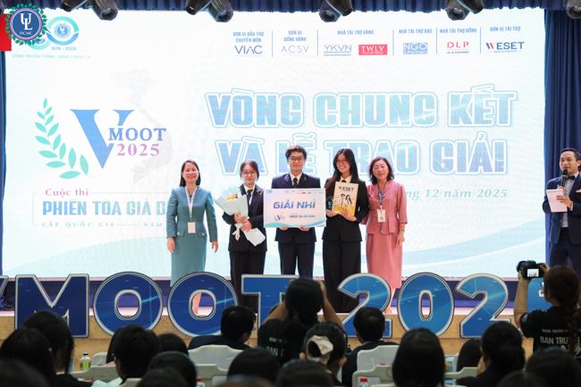 Sáng ngày 01/12/2025, tại Hội trường C.302, cơ sở Nguyễn Tất Thành, Trường Đại học Luật TP.HCM đã đăng cai tổ chức Vòng chung kết cuộc thi Phiên tòa giả định cấp Quốc gia - VMoot lần thứ IX năm 2025.