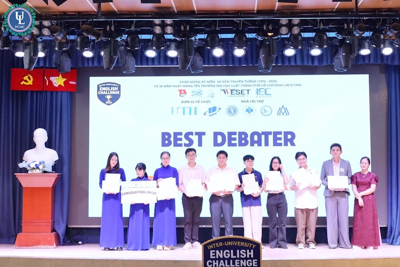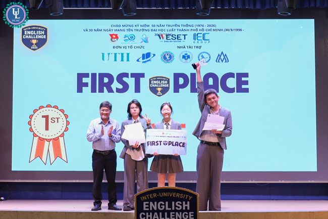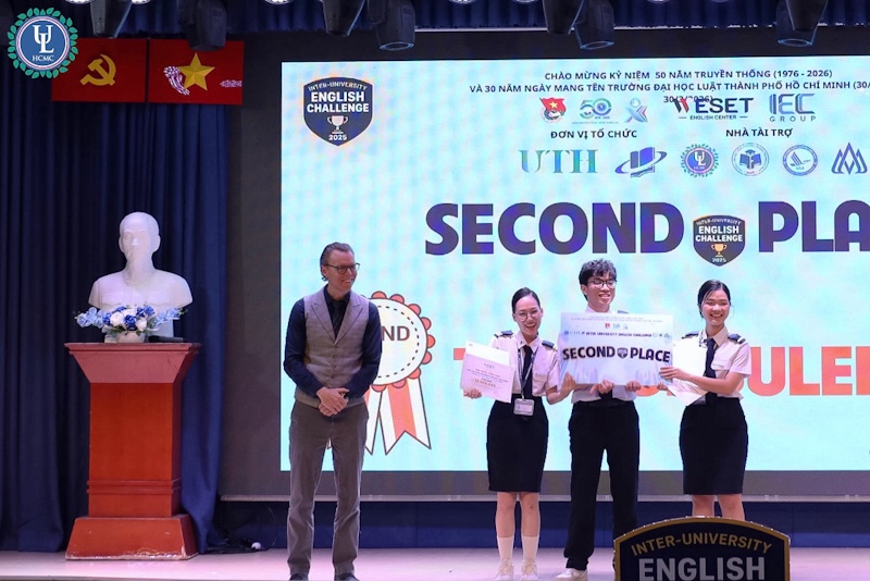 Vào chiều ngày 28/11/2025, tại hội trường C.302 cơ sở Nguyễn Tất Thành đã diễn ra Vòng Chung kết cuộc thi tiếng Anh Liên trường "Inter-University English Challenge 2025". Vượt qua những đối thủ nặng ký bằng tư duy sắc bén, đội ATE của Trường Đại học Luật TP.HCM đã xuất sắc giành ngôi vị cao nhất.