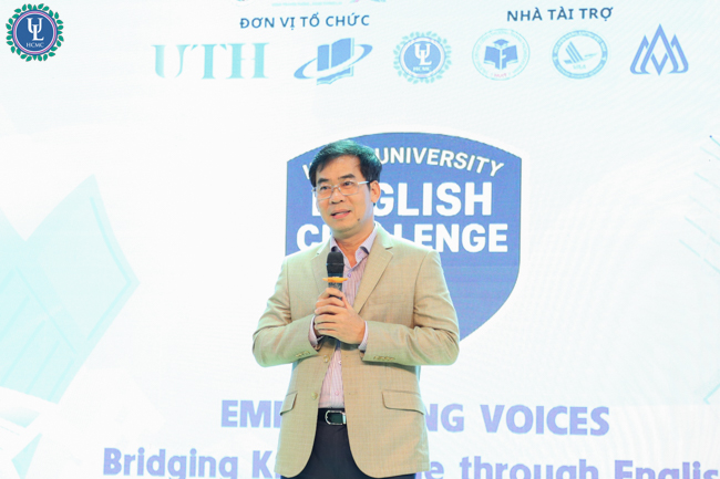Phát biểu tại cuộc thi, TS. Lê Trường Sơn - Hiệu trưởng Nhà trường nhấn mạnh ý nghĩa đặc biệt của cuộc thi trong hành trình hướng đến mốc kỷ niệm 50 năm truyền thống và 30 năm mang tên trường vào tháng 3/2026. Thay mặt Ban Giám hiệu, TS. Lê Trường Sơn gửi lời chào mừng đến toàn thể đại biểu, giảng viên, huấn luyện viên và sinh viên của 6 trường đại học tham gia vòng chung kết cuộc thi, đồng thời khẳng định rằng Inter-University English Challenge 2025 không chỉ là một hoạt động học thuật mà còn là một sân chơi kết nối, nơi sinh viên có cơ hội giao lưu, học hỏi và thể hiện năng lực tiếng Anh trong môi trường cạnh tranh lành mạnh. Hiệu trưởng nhà trường cũng cho biết cuộc thi là một trong những minh chứng rõ nét cho sự phát triển của Khoa Ngoại ngữ Pháp lý Trường Đại học Luật TP.HCM - một Khoa còn trẻ so với bề dày phát triển của trường nhưng đã nỗ lực tổ chức thành công một sân chơi quy mô liên trường, đòi hỏi tính chuyên môn và chất lượng tổ chức cao.