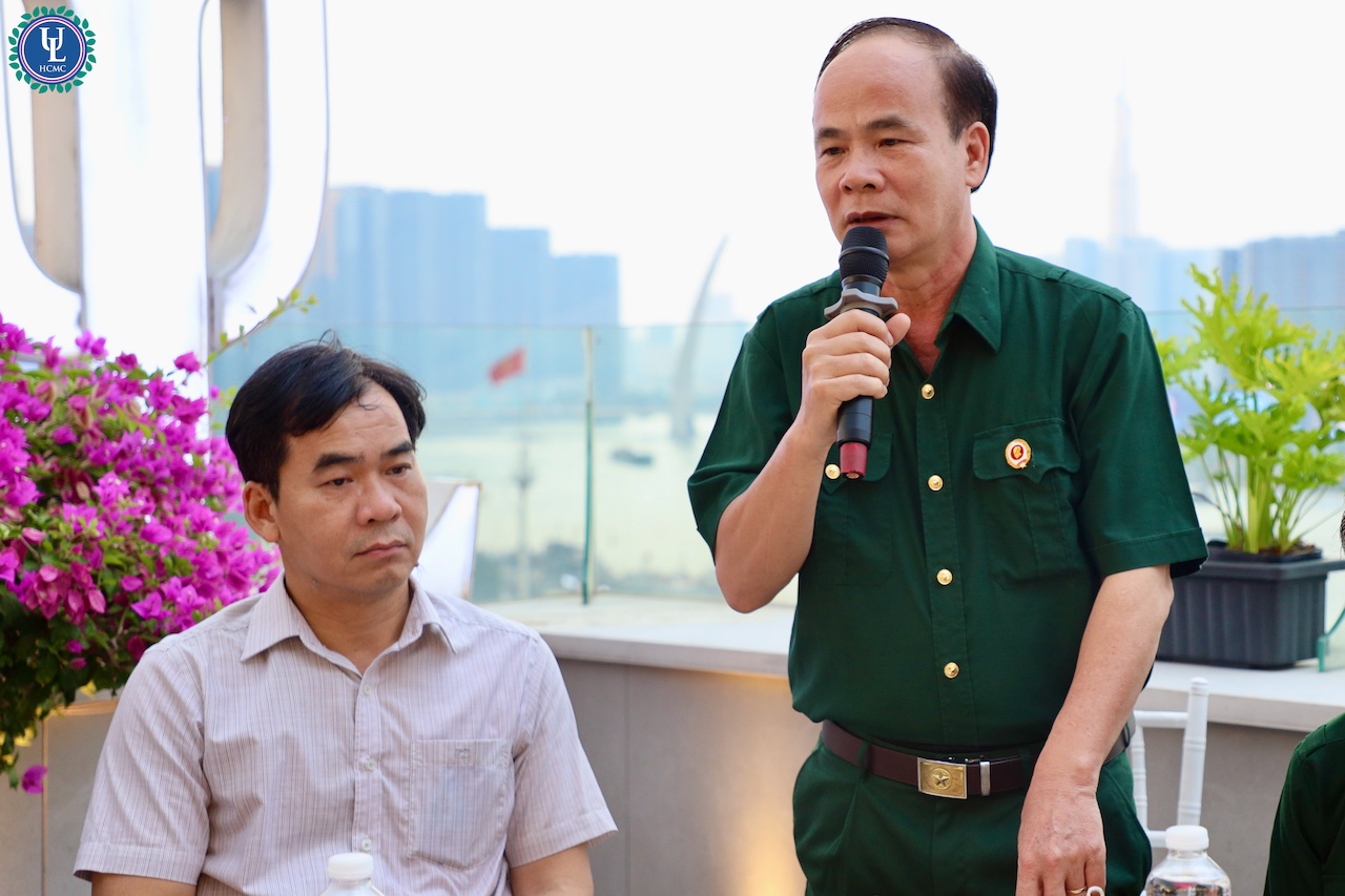 Đại diện các cựu chiến binh, Nhà thơ, Luật sư Nguyễn Minh Tâm bày tỏ niềm xúc động sâu sắc trước sự quan tâm và tình cảm chân thành của lãnh đạo Nhà trường. Bên cạnh đó, ông gửi lời chúc mừng đến những bước phát triển bền vững và thành tựu đáng tự hào của Trường Đại học Luật TP. HCM trong thời gian vừa qua. Ông chân thành cảm ơn Ban Lãnh đạo Nhà trường đã tạo điều kiện để tổ chức buổi gặp mặt ấm áp, góp phần vun đắp sự gắn bó, sẻ chia và tiếp nối giữa các thế hệ cựu chiến binh trong mái nhà chung của Nhà trường.