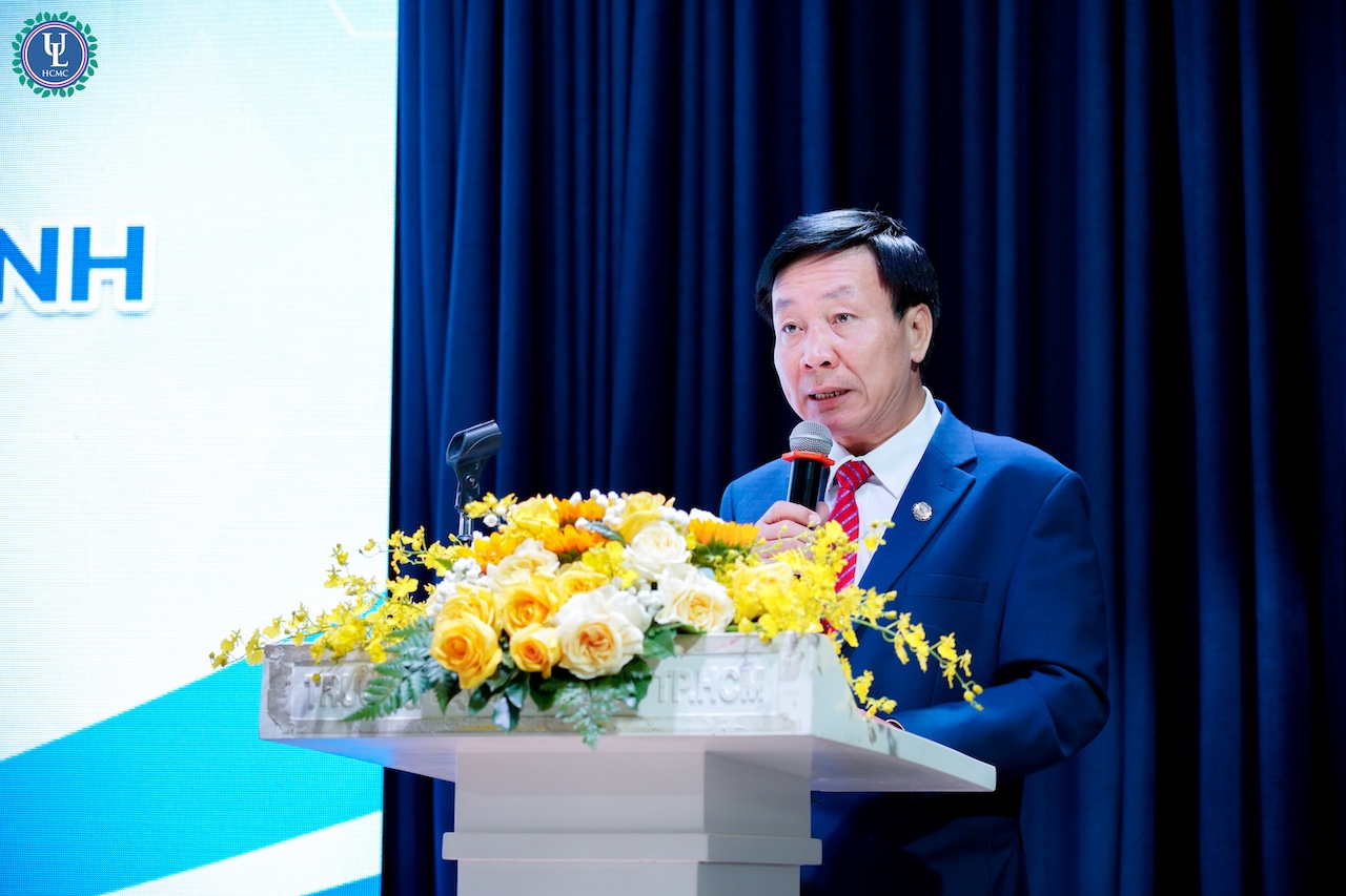 Tiếp đó, thay mặt Ban Giám hiệu, TS. Lê Trường Sơn trình bày Báo cáo tổng kết công tác năm học 2024–2025 và phương hướng năm học 2025–2026, nêu rõ những thành tựu nổi bật của Trường trong bối cảnh chuẩn bị kỷ niệm 50 năm truyền thống (1976–2026). Năm học qua, Trường hoàn tất việc thành lập Hội đồng trường nhiệm kỳ 2025–2030 được Bộ Giáo dục và Đào tạo công nhận theo Quyết định 2155/QĐ-BGDĐT; mở mới các ngành Kinh doanh quốc tế, Tài chính – Ngân hàng và chương trình Luật hình thức từ xa; triển khai hiệu quả kế hoạch tuyển sinh với hơn 3.000 sinh viên khóa 50 hệ chính quy, tỷ lệ nhập học gần 100%.