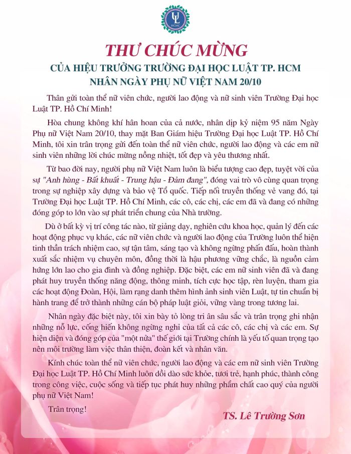 Thư chúc mừng của Hiệu trưởng Trường Đại học Luật TP.HCM nhân ngày Phụ nữ Việt Nam 20/10