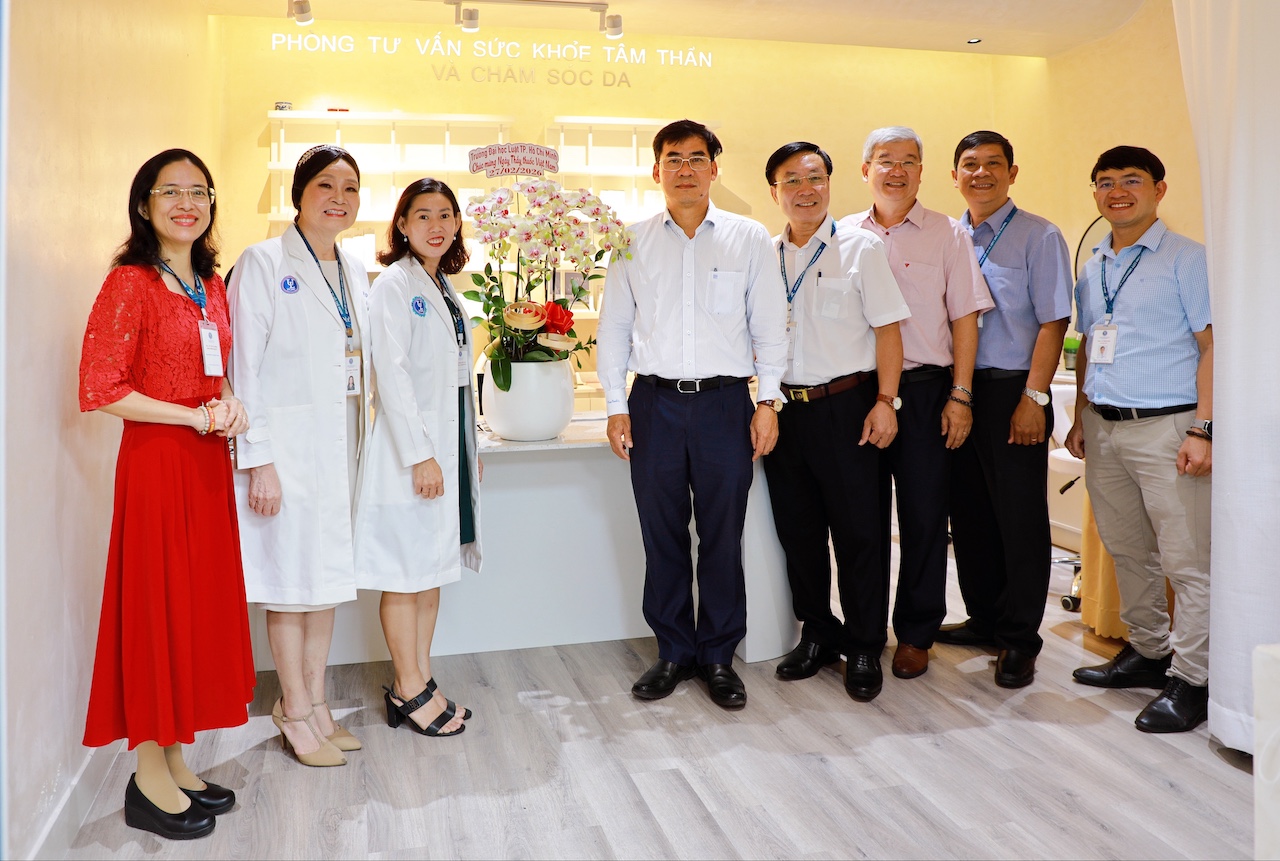 Đoàn công tác và đội ngũ y, bác sĩ Trạm Y tế chụp ảnh lưu niệm tại không gian Phòng Tư vấn sức khoẻ tâm thần và chăm sóc da của Nhà trường