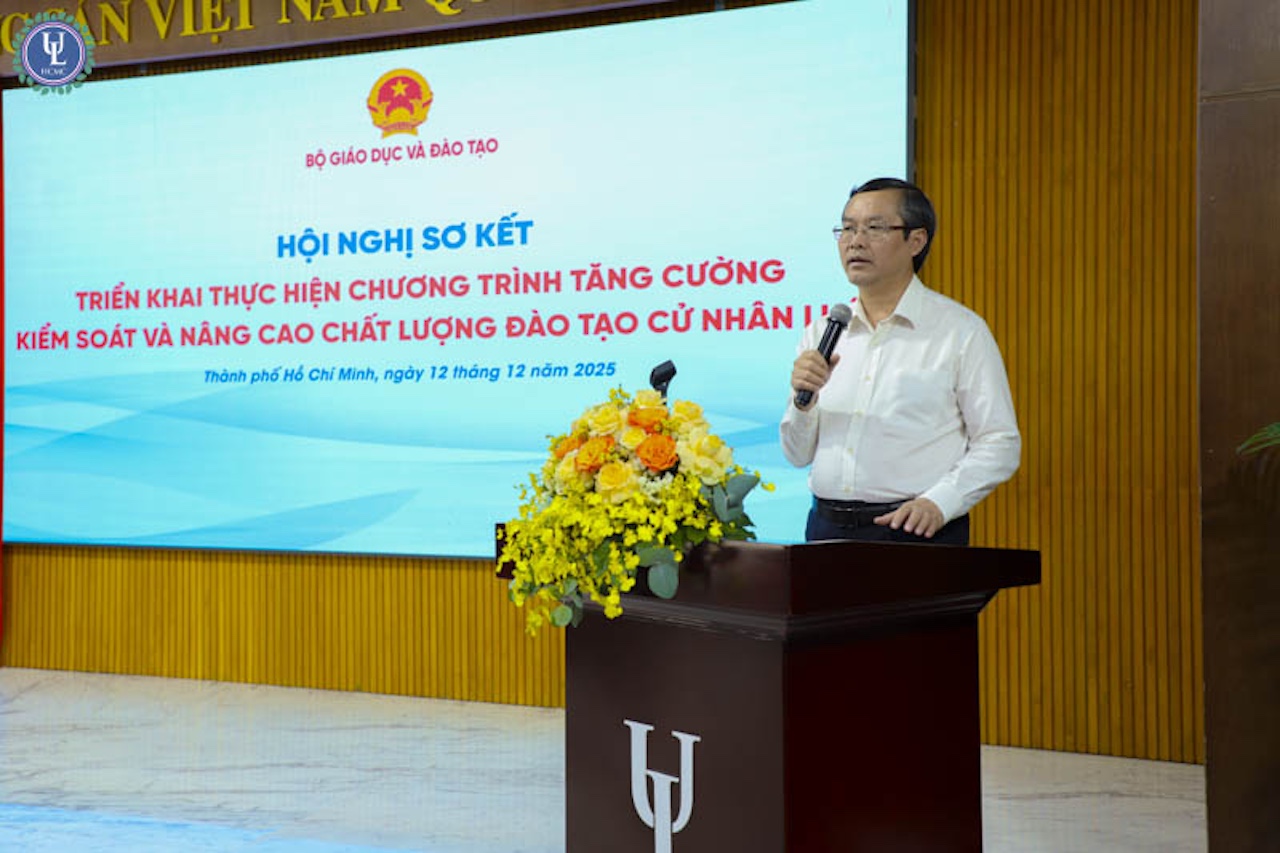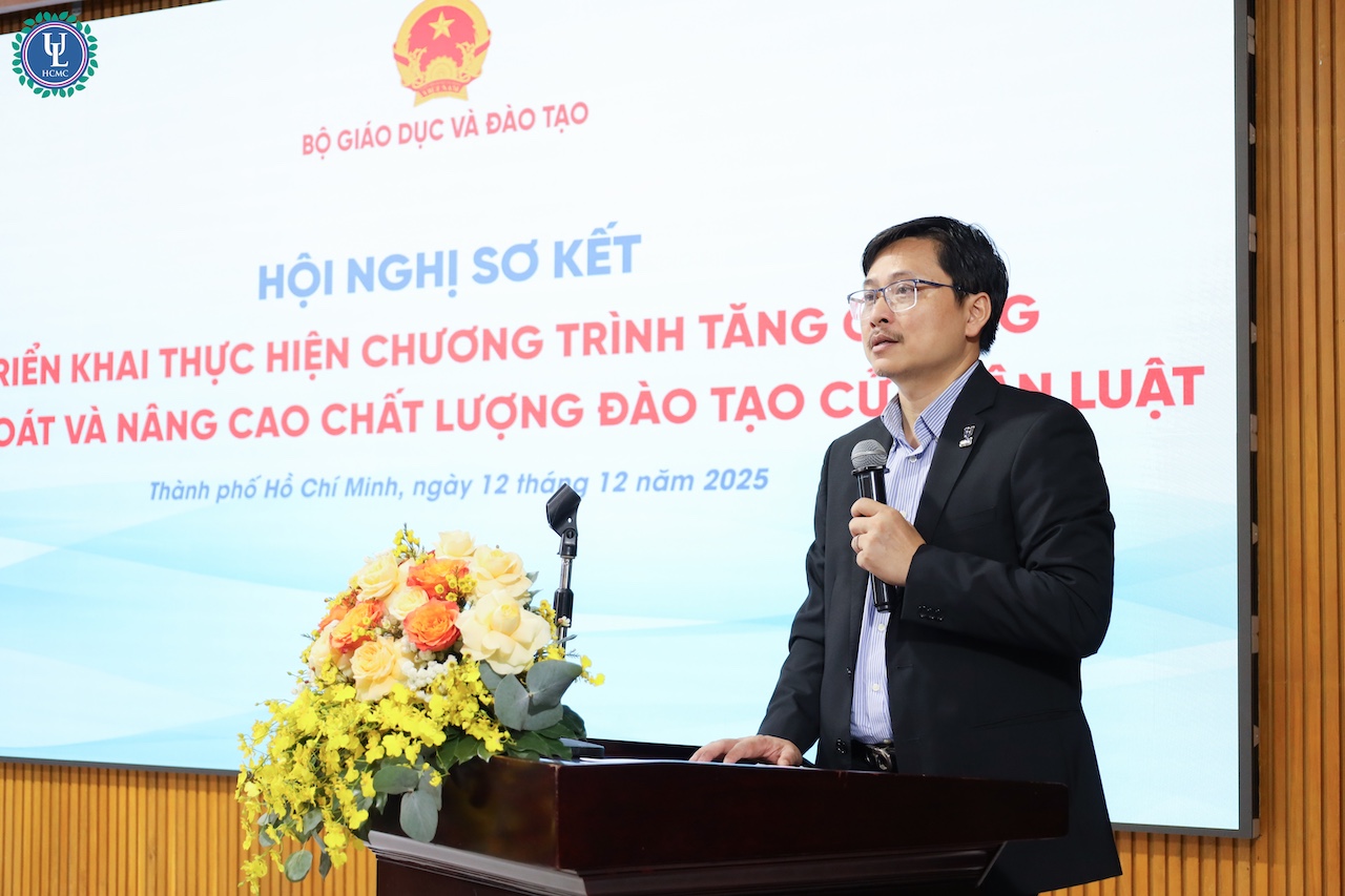 Sáng ngày 12/12/2026, Trường Đại học Luật TP.HCM đã đăng cai địa điểm để Bộ Giáo dục và Đào tạo tổ chức Hội nghị sơ kết triển khai thực hiện Chương trình “Tăng cường kiểm soát và nâng cao chất lượng đào tạo cử nhân Luật”, hội nghị diễn ra tại Hội trường A.1002, cơ sở Nguyễn Tất Thành.