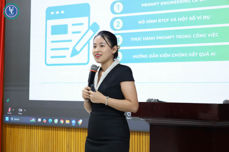 Tiếp nối chương trình, bà Phạm Thùy Linh - Nhà Sáng Lập & CEO SHE Blockchain trình bày chuyên đề về kỹ thuật xây dựng câu lệnh (prompt) hiệu quả nhằm khai thác tối đa sức mạnh của AI trong công việc. Nội dung tập trung vào sáu nguyên tắc cốt lõi: Cung cấp ngữ cảnh - Cung cấp vai trò - Cung cấp ví dụ mẫu - Chỉ định kết quả đầu ra - Chia nhỏ từng bước - Yêu cầu AI suy nghĩ từng bước. Trên cơ sở đó, chuyên đề phân tích những ưu điểm nổi bật của AI như tốc độ xử lý nhanh, khả năng khai thác kho dữ liệu lớn, đồng thời chỉ rõ các hạn chế của AI thường gặp trong quá trình sử dụng. Qua đó, có thể thấy việc ứng dụng AI hiệu quả không phụ thuộc vào công thức cố định, mà ở khả năng hiểu bản chất của việc viết prompt và biết cách điều chỉnh linh hoạt. Nội dung được nối tiếp bằng hoạt động thực hành, giúp cán bộ, giảng viên trực tiếp áp dụng sáu kỹ thuật viết prompt vào tình huống cụ thể, từ đó nâng cao khả năng khai thác AI một cách hiệu quả và an toàn. Đặc biệt chuyên gia Phạm Thuỳ Linh cũng đã giới thiệu nhiều nền tảng AI khác nhau để có thể linh hoạt và đa dạng hoá công năng cho người sử dụng tuỳ thuộc mục đích ứng dụng AI vào cụ thể công việc nào.