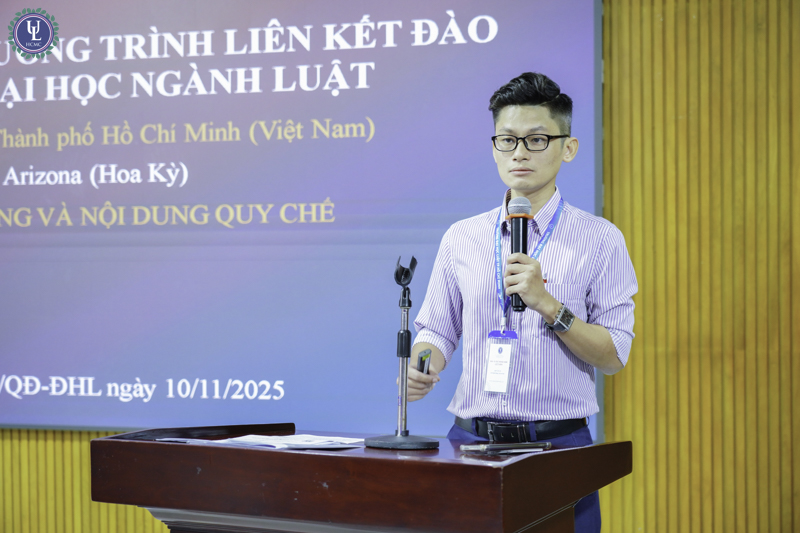 ThS. Vũ Đức Nghĩa Hưng - Viện Đào tạo Quốc tế trình bày chuyên đề Phổ biến Quy chế Đào tạo Chương trình liên kết đào tạo trình độ đại học ngành Luật giữa Trường Đại học Luật Thành phố Hồ Chí Minh (Việt Nam) và Đại học Arizona (Hoa Kỳ)