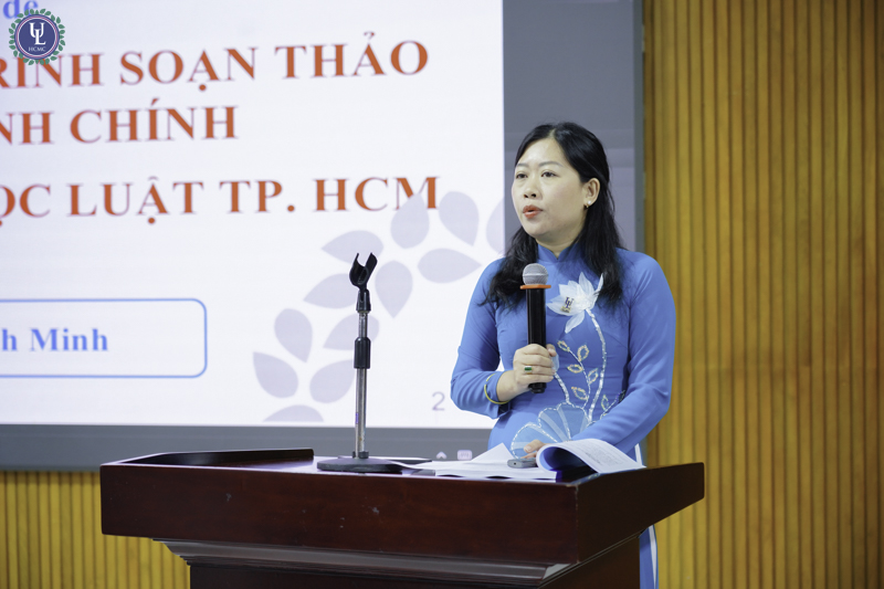 ThS.Trần Thị Ánh Minh - Phó Chủ tịch Công đoàn trường, Giảng viên kiêm nhiệm Phòng Thanh tra - Phòng chế trình bày chuyên đề Kỹ năng và quy trình soạn thảo văn bản hành chính của Trường Đại học Luật TP.HCM
