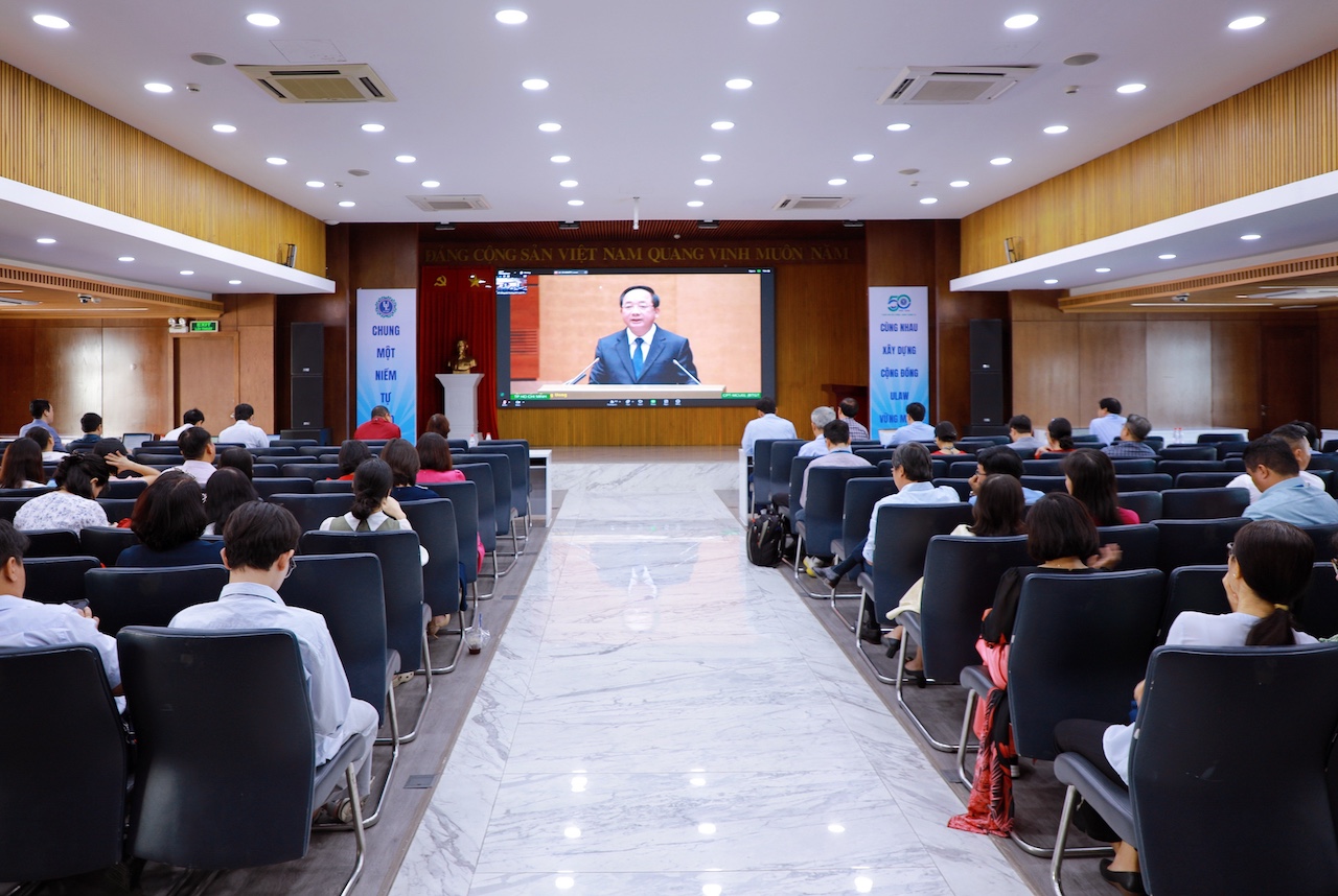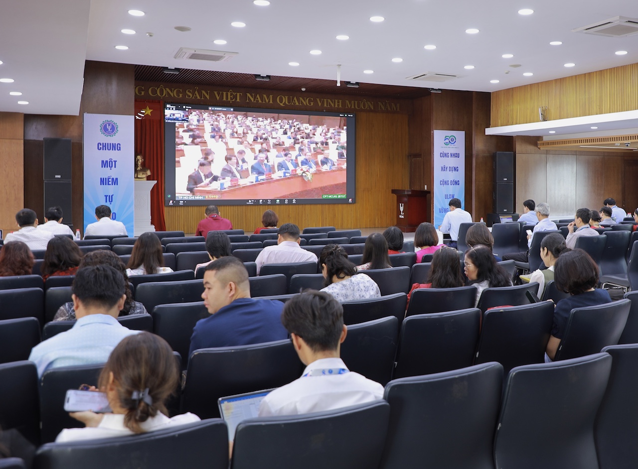 Toàn cảnh điểm cầu Trường Đại học Luật TP.HCM kết nối trực tuyến tham dự Hội nghị toàn quốc quán triệt Nghị quyết số 79-NQ/TW và 80-NQ/TW của Bộ Chính trị