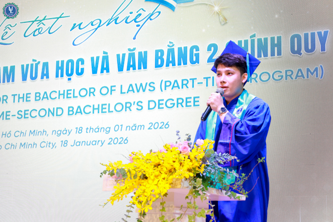 Đại diện toàn thế các tân cử nhân, sinh viên Nguyễn Hữu Khoa - Lớp trưởng lớp 14B Văn bằng 2 Chính quy, một trong hai sinh viên tốt nghiệp loại Xuất Sắc đã gửi lời tri ân chân thành đến Nhà trường và các quý thầy cô giảng viên. Chia sẻ lại buổi lễ, anh Nguyễn Hữu Khoa nhấn mạnh các anh chị sinh viên dù đến với Nhà trường với những xuất phát điểm khác nhau, nhưng lại là những người cùng nhau học tập, đồng hành dưới ngôi nhà Ulaw bằng tinh thần cầu tiến và khát vọng tri thức. Theo đó, quãng thời gian học tập tại trường đã trở thành những ký ức tươi đẹp, khó quên của tuổi trẻ. Chính nhờ những trải nghiệm ấy đã góp phần tôi luyện cho các anh chị sinh viên bản lĩnh, tinh thần trách nhiệm và ý thức cống hiến, sẵn sàng lan tỏa những giá trị tốt đẹp cho xã hội, cộng đồng. Lễ tốt nghiệp không chỉ là sự ghi nhận cho những nỗ lực bền bỉ của sinh viên trong suốt hành trình học tập, mà còn là minh chứng cho niềm tin, tâm huyết và sự dẫn dắt tận tâm của thầy cô – những người đã âm thầm gieo vào lòng sinh viên tinh thần thượng tôn pháp luật và trách nhiệm của người làm luật trong tương lai.