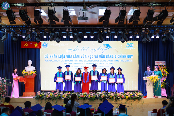 Sáng ngày 18/1/2026, tại Hội trường C.302, cơ sở Nguyễn Tất Thành, Trường Đại học Luật TP. HCM đã long trọng tổ chức Lễ tốt nghiệp và trao bằng Cử nhân cho sinh viên trình độ đại học hình thức đào tạo chính quy (văn bằng 2) và vừa làm vừa học.