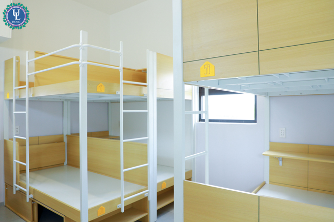 Không gian phòng ở được bố trí gọn gàng, đầy đủ giường, tủ và bàn học đáp ứng nhu cầu sinh hoạt cơ bản cho sinh viên