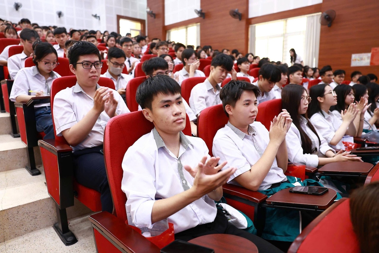 Tại hội trường, các em học sinh đã được lắng nghe những thông tin tuyển sinh quan trọng nhất cho năm 2026. ThS. Vũ Đình Lê – Phó Trưởng phòng phụ trách Phòng Tư vấn tuyển sinh đã giới thiệu chi tiết về các ngành đào tạo cốt lõi như Luật, Luật Thương mại quốc tế, Quản trị - Luật, Quản trị kinh doanh, Ngôn ngữ Anh,... cũng như các ngành dự kiến mở mới như Thương mại điện tử, Kinh tế số, Công nghệ tài chính, Ngôn ngữ Trung Quốc (chuyên ngành tiếng Trung pháp lý).